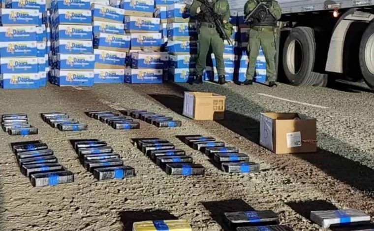 Como resultado de la inspección del camión, personal de la Sección de Investigaciones Antidrogas de la Gendarmería descubrió 53 paquetes de cocaína, por un peso de 56,514 kilos.