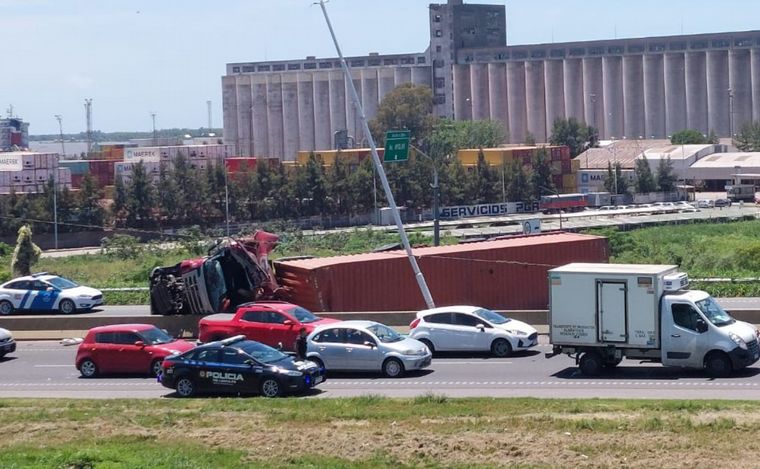 Un camión con container volcó en el Acceso Sur y Av. Uriburu tras chocar con un auto por razones que se buscan establecer. El siniestro se dio en horas del mediodía.
