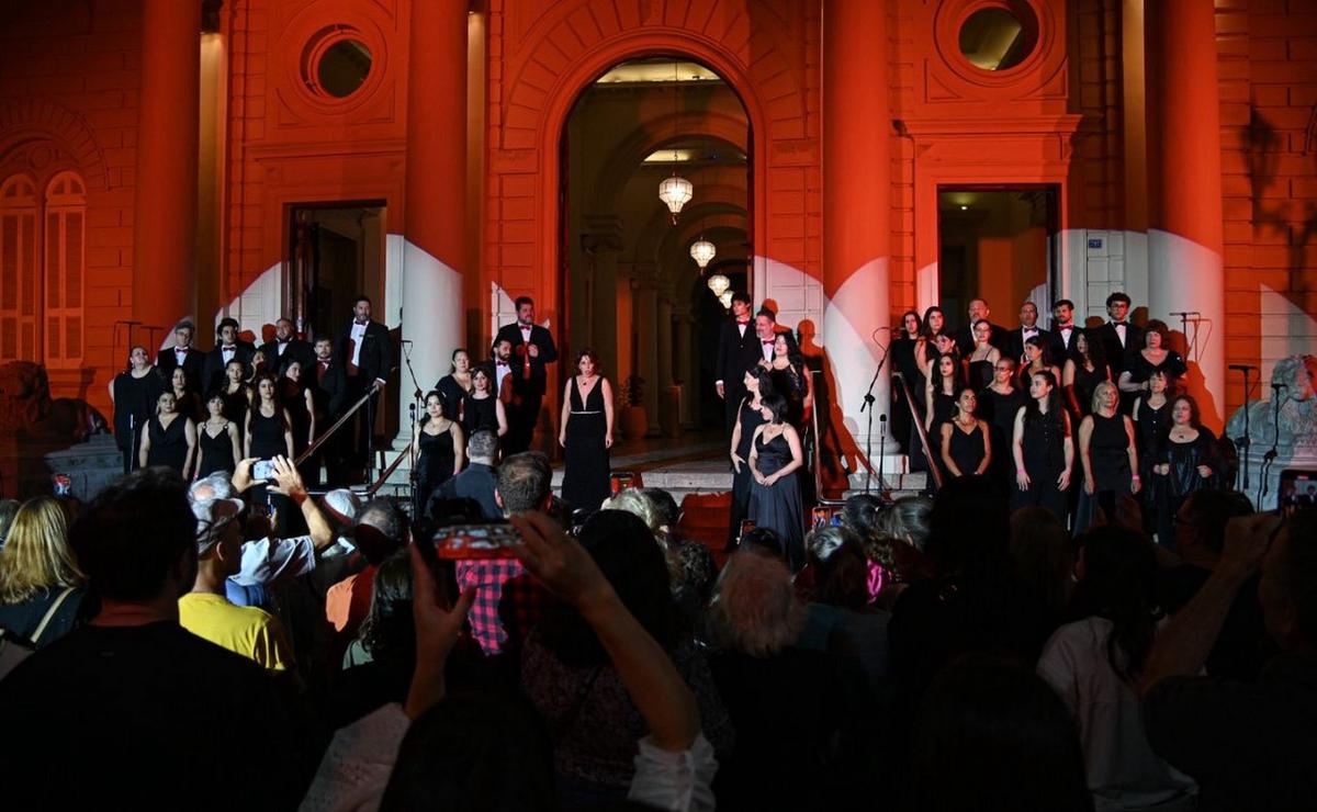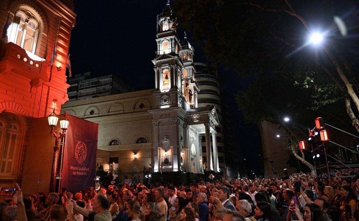 Luego, las campanas del Palacio Municipal y de la Catedral repicaron al unísono en un cruce simbólico que anticipó el espectáculo principal: un imponente flashmob de la Ópera del Teatro El Círculo, con 50 músicos y cantantes interpretando clásicos de Puccini, Bizet y Verdi desde los balcones del Palacio Municipal. El cierre fue “Es Rosario”, la canción compuesta por Fabián Gallardo para los 300 años de la ciudad.