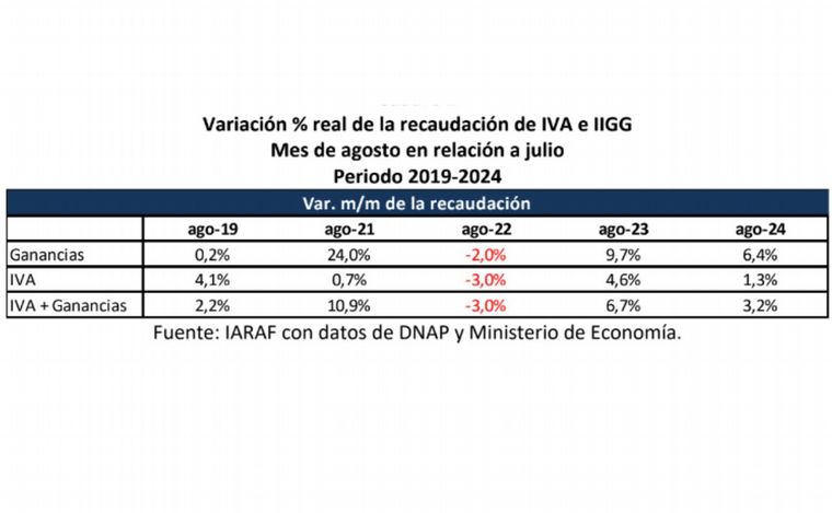 En comparación con julio, la recaudación conjunta de IVA y ganancias creció un 3% en términos reales, aunque la recaudación de ganancias cayó un 6,4%, en línea con tendencias anteriores. Por otro lado, el IVA tuvo un incremento real del 1,3% respecto al mes anterior.