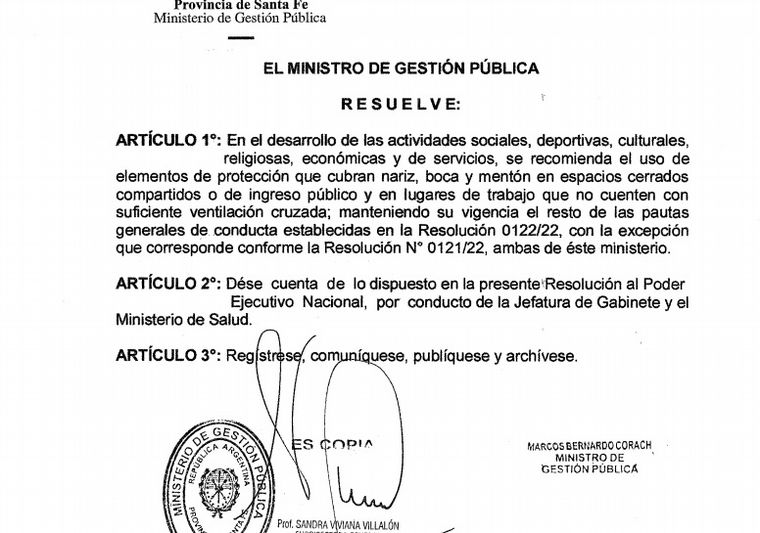 Es una disposición del Ministerio de Gestión Pública de Santa Fe, en la cual, no obstante, se recomienda usar “elementos de protección que cubran nariz boca y mentón” en determinados casos.