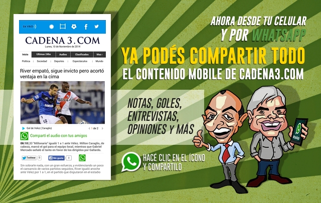 Todas las notas y los audios de la plataforma mobile de Cadena3.com que ya compartías a través de Facebook y Twitter, ahora suman la opción para hacerlo a través del mensajero gratuito WhatsApp.