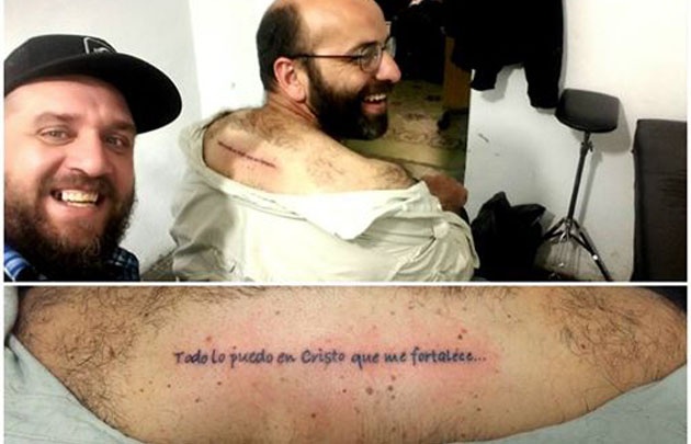 El religioso eligió una frase de San Pablo para llevar en su piel: “Todo lo puedo en Cristo que me fortalece”. “Es una forma de recordarle al lomo que cuando Cristo está sosteniendo las cargas se pueden llevar”, explicó.