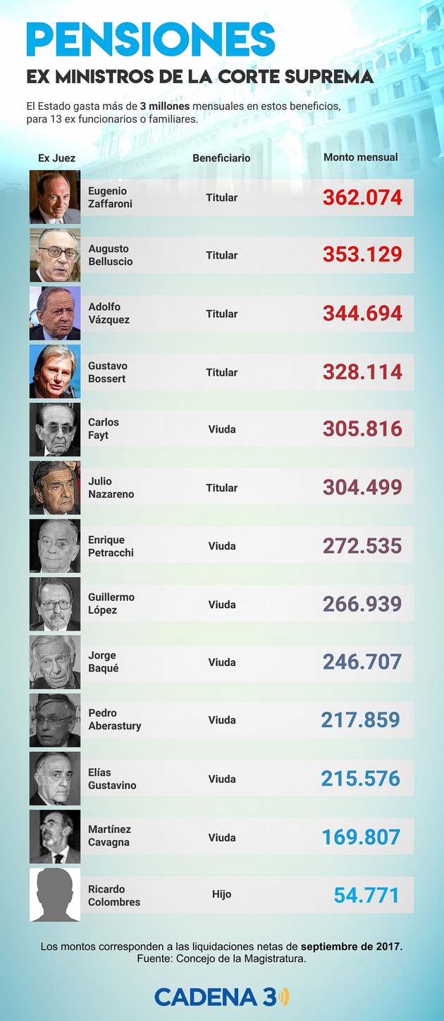 El Ministerio de Hacienda de la Nación –a pedido de la titular de la presidenta del Consejo de la Magistratura, Adriana Donato– elaboró un listado de los montos de las pensiones vitalicias que perciben 13 ex ministros (o familiares) de la Corte Suprema de Justicia de la Nación y un dato llamativo es que ascienden a más de 300 mil pesos, superando el sueldo del propio presidente.
