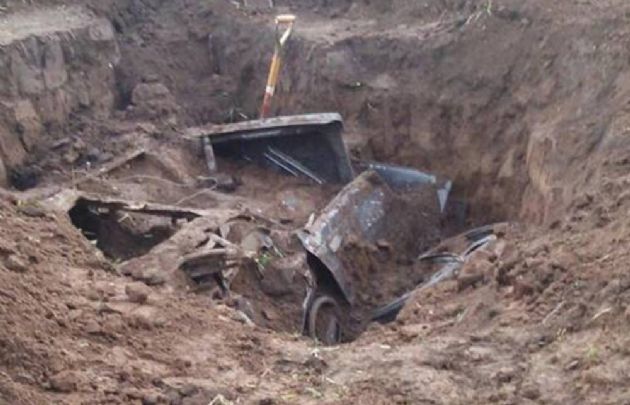 Buena parte del automóvil estaba oculto bajo tierra, mientras que en el interior de la vivienda se encontraban el motor y las ruedas.