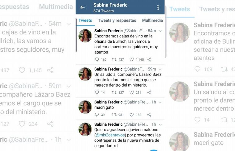 En el perfil de Sabina Frederic aparecieron al menos cinco mensajes que se referían al ex presidente, Mauricio Macri, a la ex titular de la cartera, Patricia Bullrich, y a Lázaro Báez, entre otros.