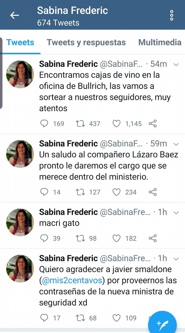La cuenta de la red social Twitter de la nueva ministra de Seguridad de la Nación, Sabina Frederic, fue hackeada este miércoles con al menos cinco mensajes que se referían al ex presidente Mauricio Macri, a la ex titular de la cartera, Patricia Bullrich, y al empresario Lázaro Báez, entre otro temas.