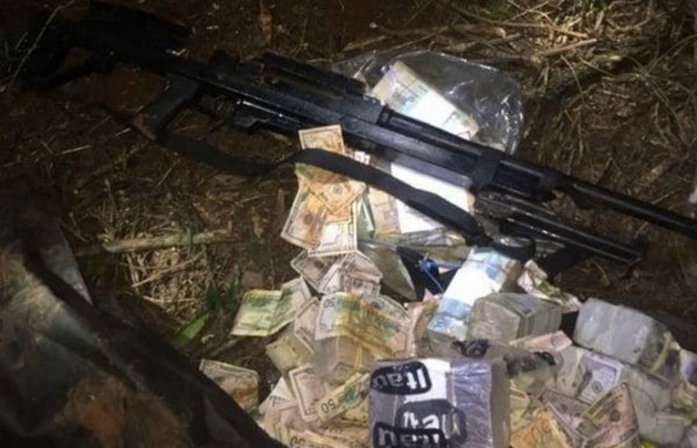En el bolso había fajos de billetes de 100 reales, 100 dólares y guaraníes, además de un fusil anti aéreo calibre Punto 50, informó el diario ABC Color.