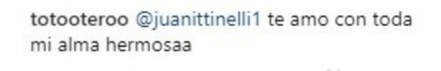 Acto seguido "Toto", el hijo de Florencia Peña se sumó al post con unas palabras para su novia: "@juanittinelli1 te amo con toda mi alma hermosa".