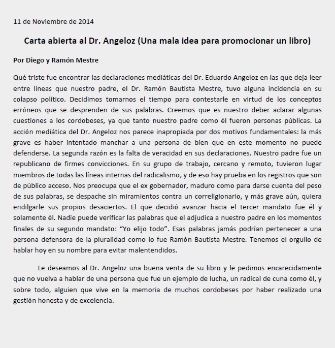 Con una carta abierta, los hermanos Ramón y Diego Mestre replicaron al ex mandatario radical, Eduardo César Angeloz, por los cuestionamientos que éste hizo al padre de ambos.