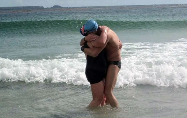 El argentino Matías Ola, de 30 años, y la inglesa Jackie Cobell, de 60, cruzaron a nado el Estrecho de San Carlos y unieron las Islas Malvinas de oeste a este para dar "un mensaje de paz, amistad y armonía en memoria de los caídos, considerando que no vale la pena seguir sembrando enemistad".
