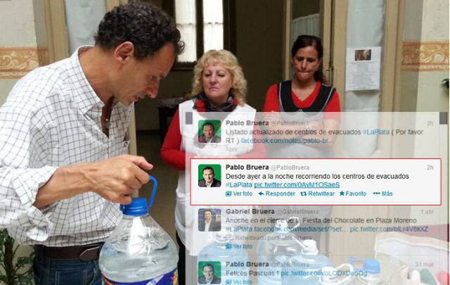 Ayer, Pablo Bruera quedó envuelto en una polémica por un mensaje difundido en Twitter sobre su tarea de asistencia a las víctimas del temporal cuando, en realidad, se encontraba en Brasil.