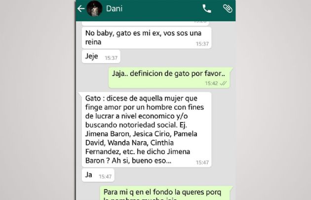 "Gato: dícese de aquella mujer que finge amor por un hombre con fines de lucrar a nivel económico y/o buscando notoriedad social. Ej. Jimena Barón Jésica Cirio, Pamela David, Wanda Nara, Cinthia Fernández, etcétera", le habría escrito Osvaldo a una chica, de la cual aún no trascendió su identidad.