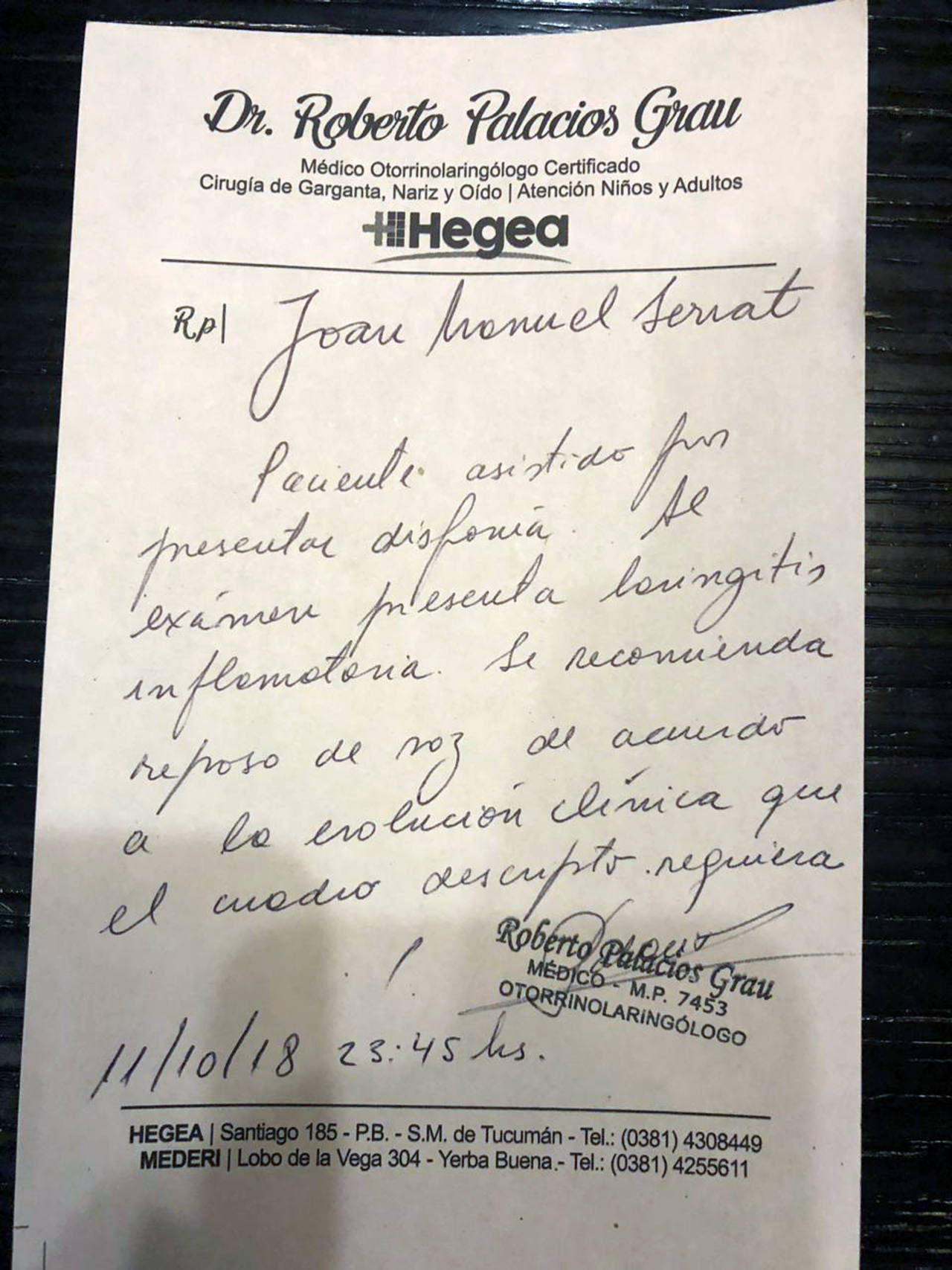 Según el médico otorrinolaringólogo (MP 7453) Roberto Palacios Grau, el cantante español presenta laringitis inflamatoria, ante lo que se recomienda reposo de voz de acuerdo a la evolución clínica que el cuadro descripto requiera.