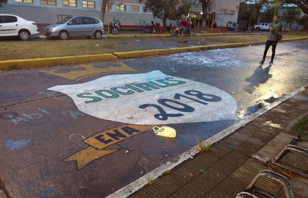 En San Francisco, Córdoba, la promoción 2018 de la Escuela Normal Nicolás Avellaneda celebró en la entrada del colegio e hicieron una prolija pintada sobre el asfalto en la entrada del colegio.