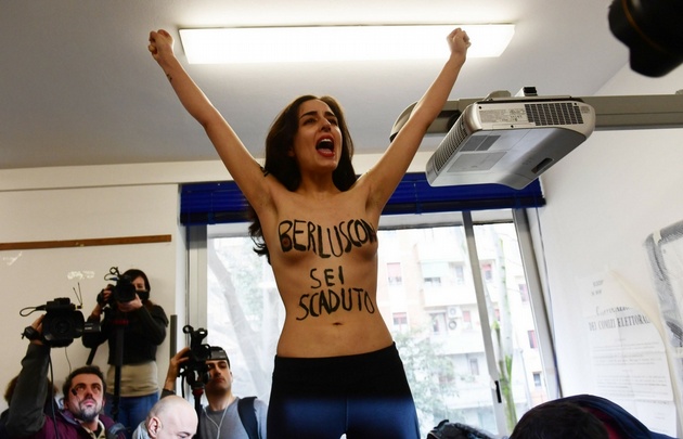 Una mujer con el torso desnudo repudió este domingo a Silvio Berlusconi, a quien le gritó "estás caduco", cuando el ex primer ministro italiano votaba en un colegio de Milán, al promediar la jornada electoral en Italia.