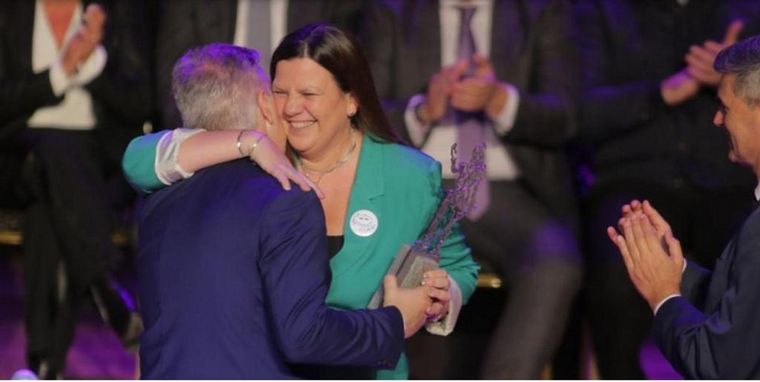Nora Cingolani de Down is Up recibiendo el Jerónimo de la Gente de manos del intendente de Córdoba Martín Llaryora