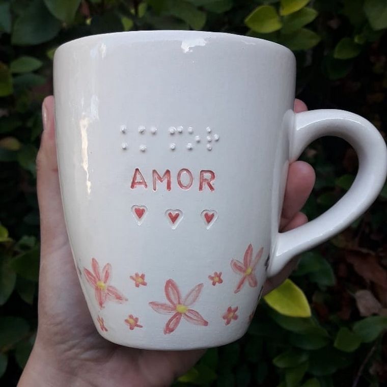 De manera artesanal pinta a mano y decora tazas de cerámica con mensajes en braille y en escritura convencional.