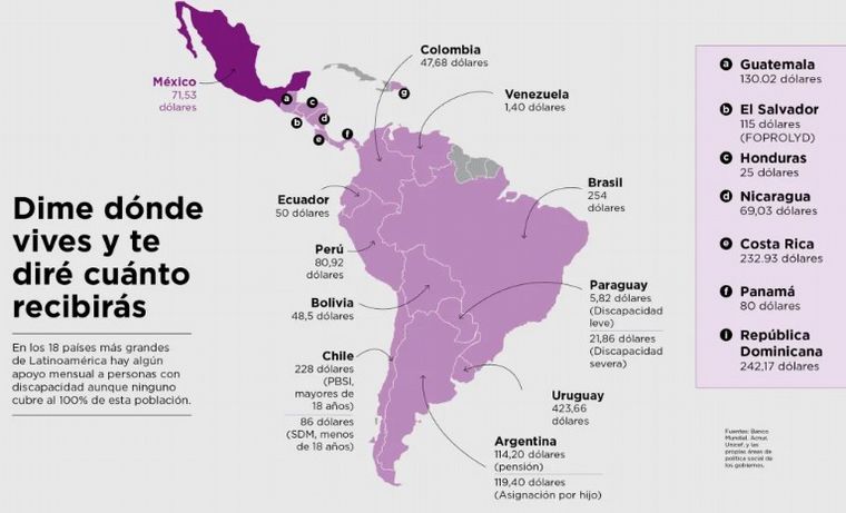 En el otro extremo están los países que menos apoyan con transferencias directas a su población con discapacidad son Venezuela (1.40 dólares), Paraguay (5.82 dólares) y Honduras (25 dólares).