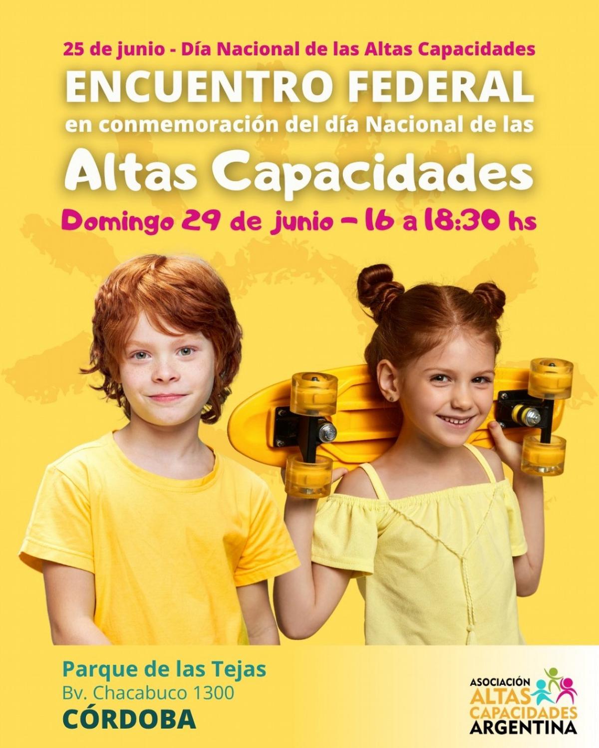 En el marco del Día Nacional de las Altas Capacidades, que se conmemora cada 25 de junio, la Asociación Altas Capacidades Argentina (AACA) invita a la comunidad a participar de un encuentro especial el próximo sábado 29 de junio en el Parque de las Tejas y el Museo Plaza Cielo Tierra, en la ciudad de Córdoba.