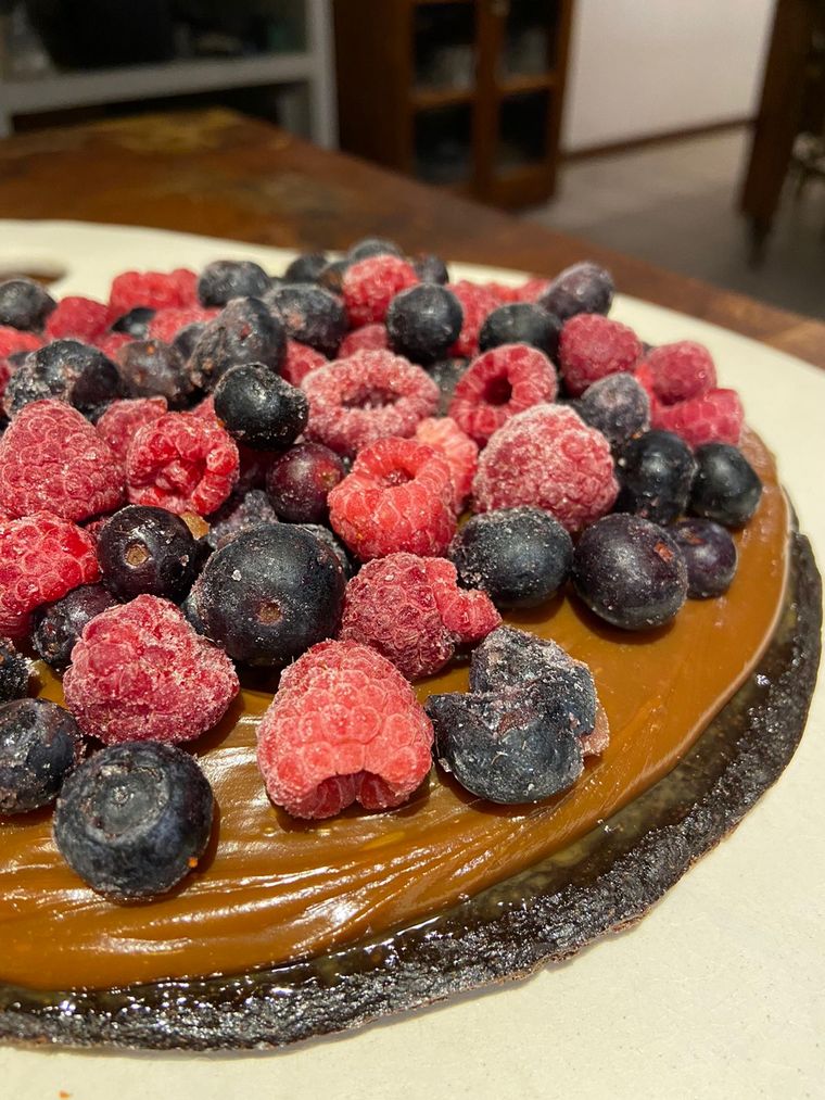 Retiramos dejamos enfriar y colocamos una generosa capa de dulce de leche sin azúcar y decoramos con frutos rojos congelados previó a servir.
