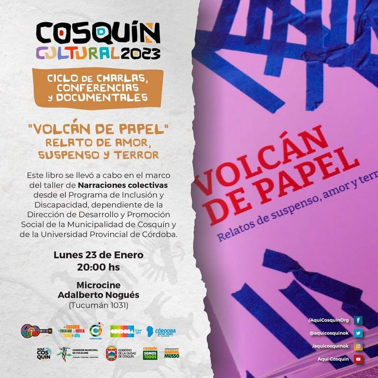 "Volcán de papel", un libro de relatos de amor, suspenso y terror es una producción que se hizo en el marco del Taller de Narraciones Colectivas que se llevó a cabo desde el Programa de Inclusión y Discapacidad (que funciona en Desarrollo y Promoción Social del Municipio de la Ciudad de Cosquín) y de la Universidad Provincial de Córdoba.