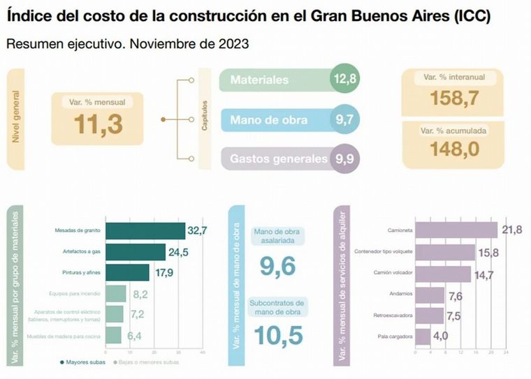 El nivel general del Índice del costo de la construcción (ICC) en el Gran Buenos Aires correspondiente a noviembre de 2023 registró una suba de 11,3% respecto al mes anterior. Este resultado surge como consecuencia de un alza de 12,8% en el capítulo “Materiales”, de 9,7% en el capítulo “Mano de obra” y de 9,9% en el capítulo “Gastos generales”.