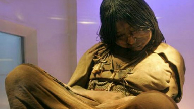 La Doncella: de 15 años al momento de la ofrenda. En su rostro aún conserva restos de pigmento rojo, y en su boca pequeños fragmentos de hoja de coca. Posiblemente haya sido una Virgen del Sol.