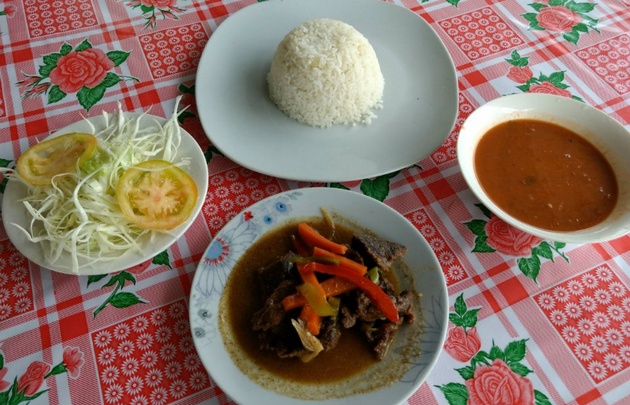 El plato se compone de arroz blanco, carne guisada preparada con morrón y cebolla y bien condimentada, acompañada por habichuelas (conocidas en Argentina como porotos) y una porción de ensalada.