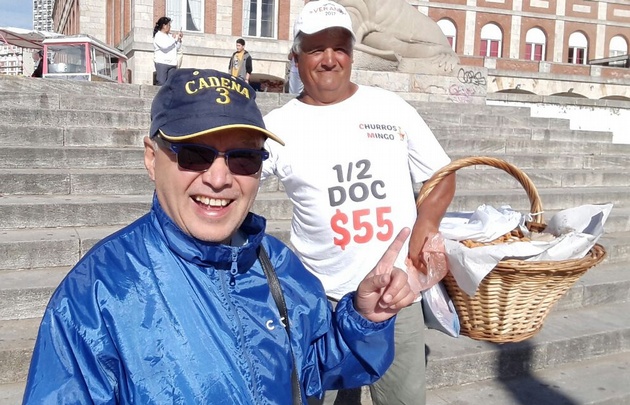 Entre los vendedores ambulantes, un cordobés ofrece la media docena de churros o bolas de fraile a $55 pesos y asegura que llegó a vender 50 docenas en cuatro horas de trabajo.
