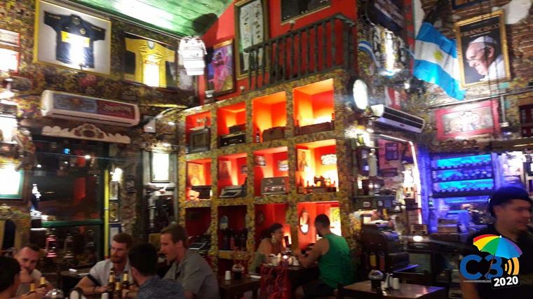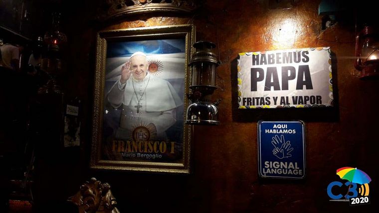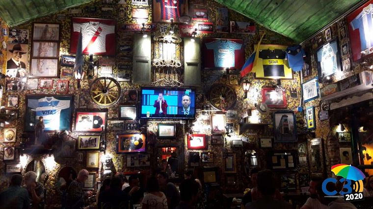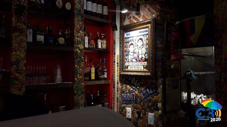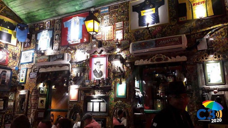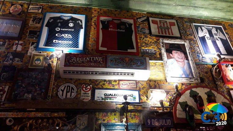 Música de tango de fondo se fusionan con las fotos de Maradona, Messi, Gardel, el Papa Francisco y Gustavo Cerati, que se pueden observar en todas las paredes, como así también camisetas de varios equipos del fútbol argentino, entre ellas, las de Belgrano y Talleres.