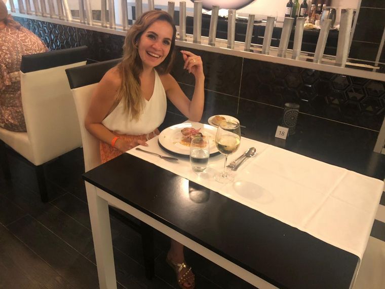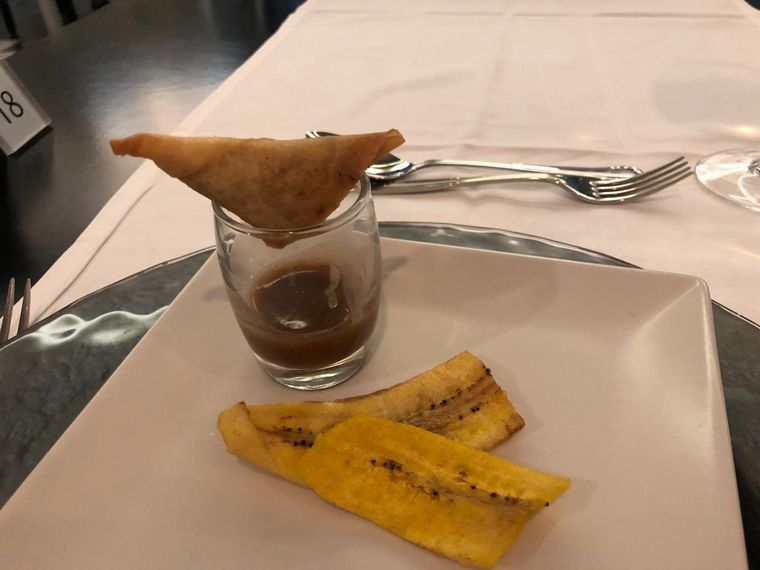De aperitivo, Agustina probó una especie de empanada con pollo jerk, acompañada de una salsa fuerte.