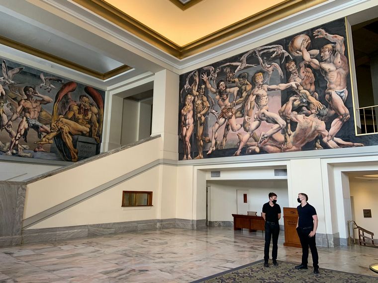 Fue entonces cuando convocó a su hijo, César Bustillo, para que pintara los enormes frescos que engalanan el mural principal.
