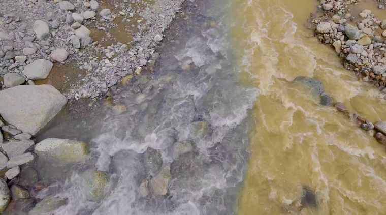 En este lugar, conocido como Paraje Las Cuevas, dos cursos de agua distintos convergen, pero sus aguas no se fusionan. Corren varios metros separadas entre sí, cada una con su color. Después de una corta distancia, el amarillo tiñe todo el torrente.