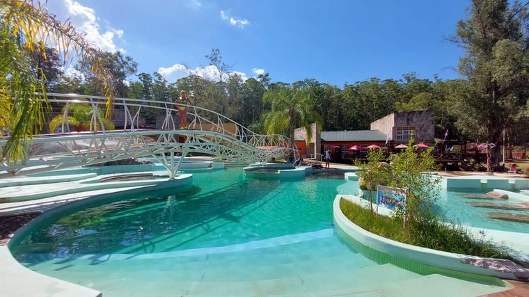Cuenta con una pileta integrada por otras siete piletas pequeñas con distintas temperaturas, que van desde los 37 hasta los 43 grados. Tiene sillones de hidromasajes, burbujas de aire comprimido y cascadas de piedra que le dan un escenario característico. En medio de una vegetación abundante, la piscina central está coronada por un puente estructural que atraviesa todas las piletas.