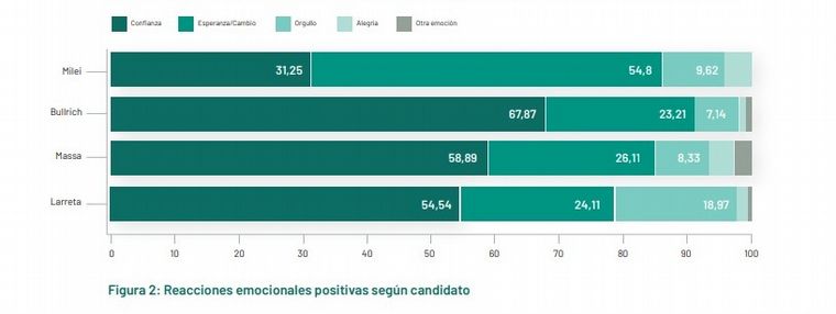 De acuerdo al estudio, de los cuatro candidatos, Javier Milei es el que genera menores niveles de confianza (sólo el 31,25% de sus votantes mencionó la confianza), sin embargo, es el candidato que posee los niveles más altos de esperanza y cambio (en el 54,81% de sus votantes).