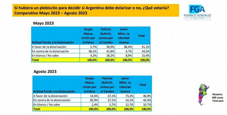 Sin embargo, un informe del consultor Federico González (400 casos presenciales) que compara datos de mayo y agosto (posPASO) sobre la principal propuesta de Milei -la dolarización- muestra una modificación a tener en cuenta.