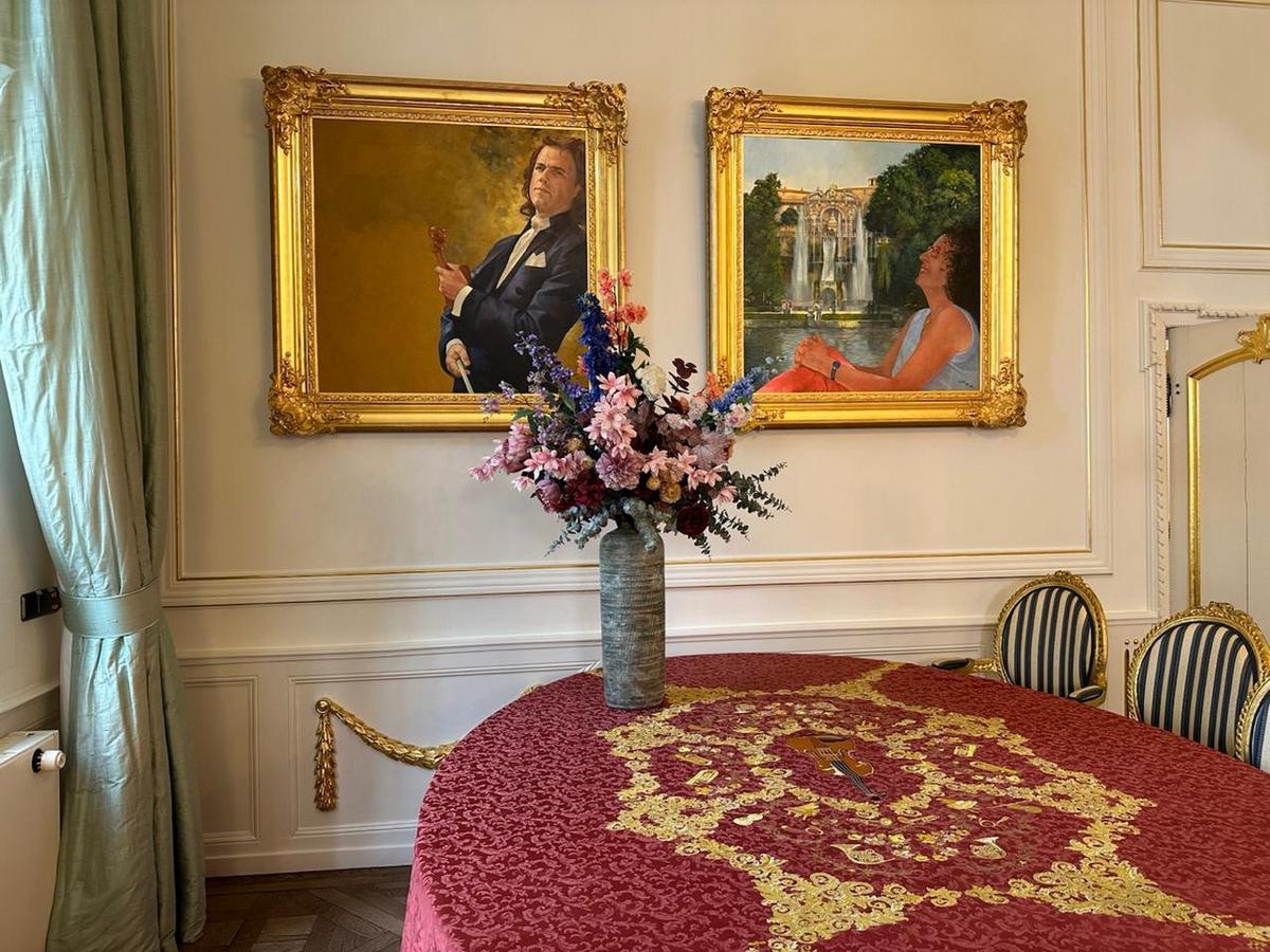 Adentro, el castillo tiene una organización que te cuenta una vida: pisos superiores montados como oficinas donde trabaja gente —unas veinte personas—, la planta baja preparada para recibir visitantes y grabaciones. Salas con chimeneas auténticas, paletas cálidas, mobiliario barroco, cortinas de seda brillantes, retratos de André y Marjorie, su esposa, jóvenes, una pintura hecha por Pierre. Afuera, el patio con fuente, la orangerie "a la francesa" que mandó a construir, el gusto por el pan de oro, la idea de casa-museo con objetos de violín por todos lados. Y esa obsesión por las flores: hay más flores afuera que adentro. Un detalle que no explica nada y, al mismo tiempo, explica todo.