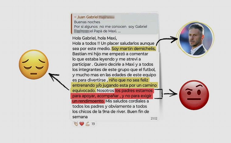 -Al enterarse de esta situación ,el técnico decidió escribir en ese grupo de whatsapp que comparte con los padres y el mensaje fue el siguiente.” Hola a todos, un placer saludarlos aunque sea por este medio. Soy Martín Demichelis. Bastián, mi hijo, me empezó a comentar lo que estaba leyendo y me atreví a participar.