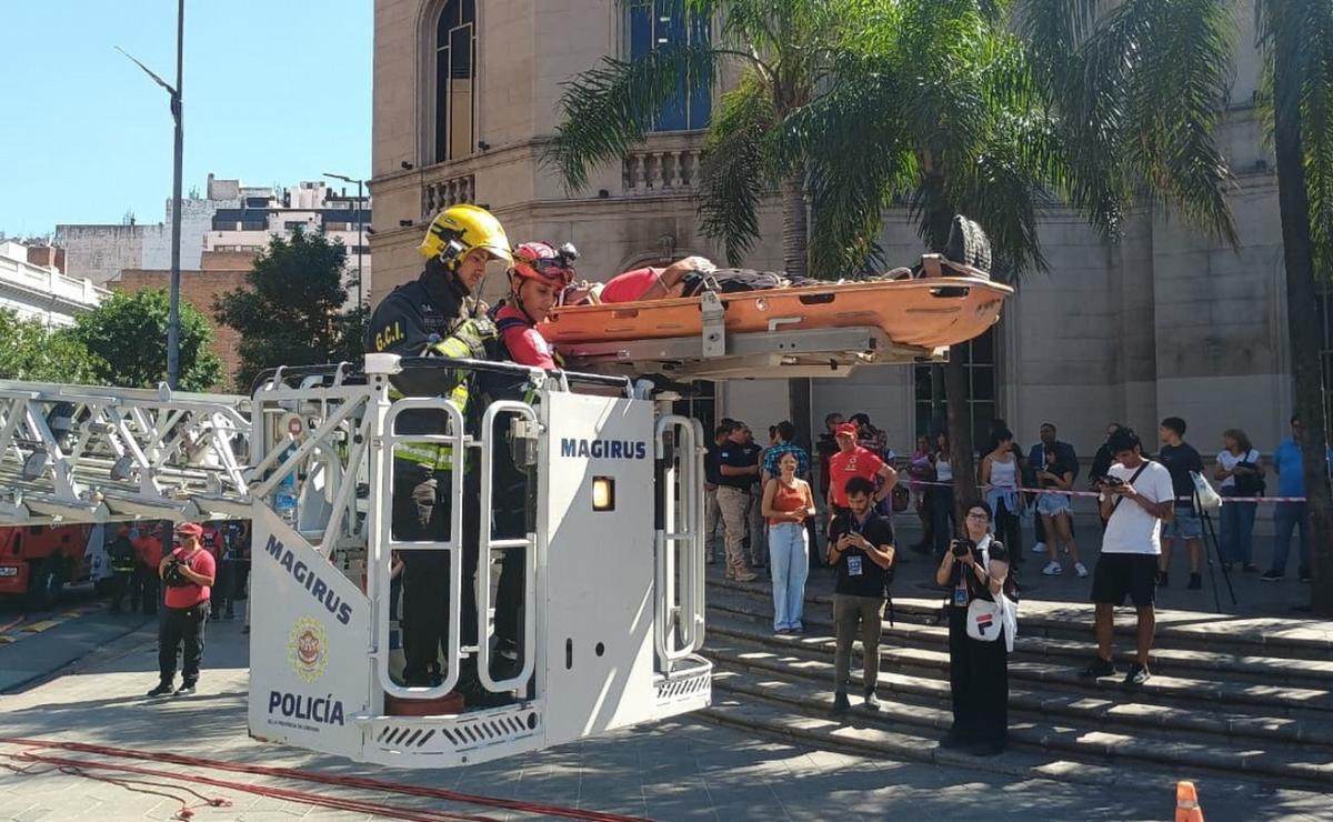 Bomberos de la Policía de la Provincia de Córdoba realizan este lunes un simulacro de incendio y rescate en el Patio Olmos.