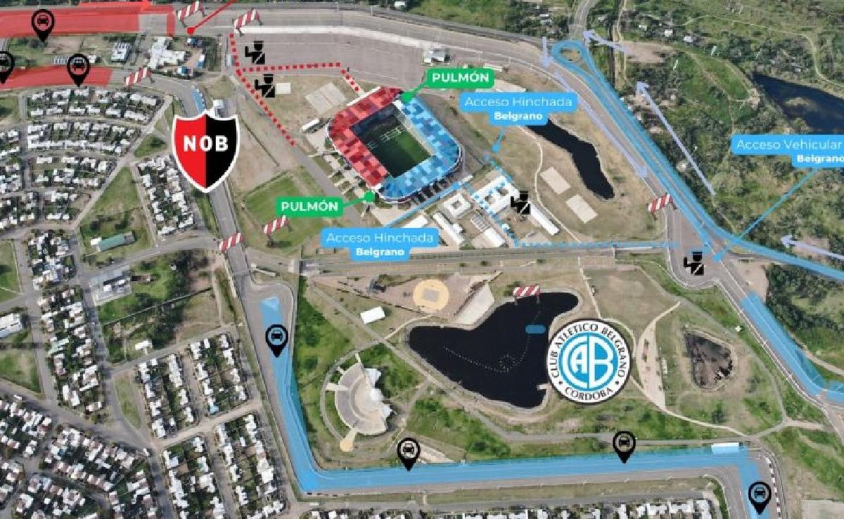Los seguidores de Newell's ocuparán la Popular Norte y la Platea Oeste, ingresando al estadio por el sector del hospital de La Pedrera y la avenida Santana Alcaraz. Por su parte, los hinchas de Belgrano ocuparán la Popular Sur y la Platea Este, accediendo al recinto por la ruta Costanera Sur y la avenida Santana Alcaraz.
