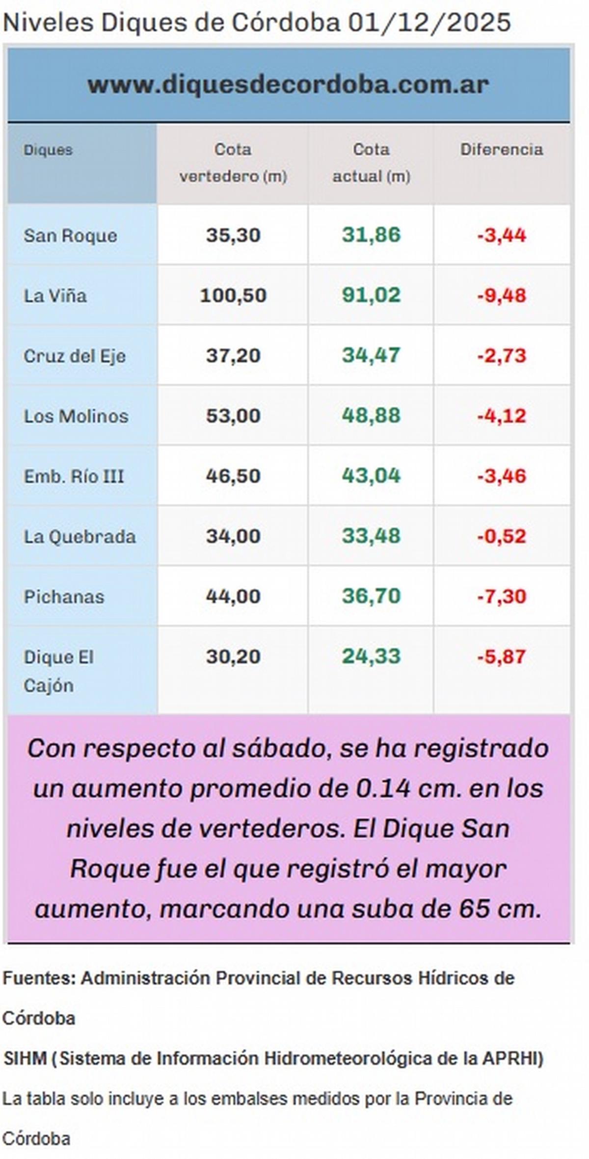 El San Roque fue el que registró el mayor aumento, marcando una suba de 65 centímetros. Con respecto al sábado, hubo un aumento promedio de 0.14 cm. en los niveles de los vertederos.