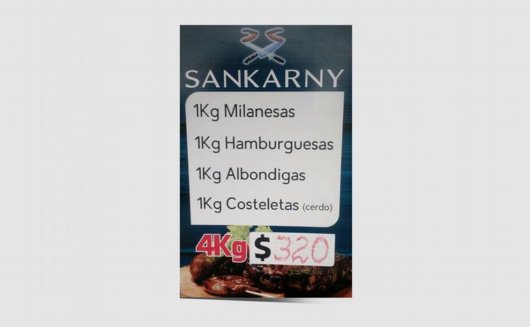El negocio en cuestión se llama "Sankarny", una mezcla entre el apellido del diseñador y un término que remite a la carne y tiene un logo es similar al de la marca de zapatos, pero con cuchillos, morcillas y chorizos que se entrecruzan.