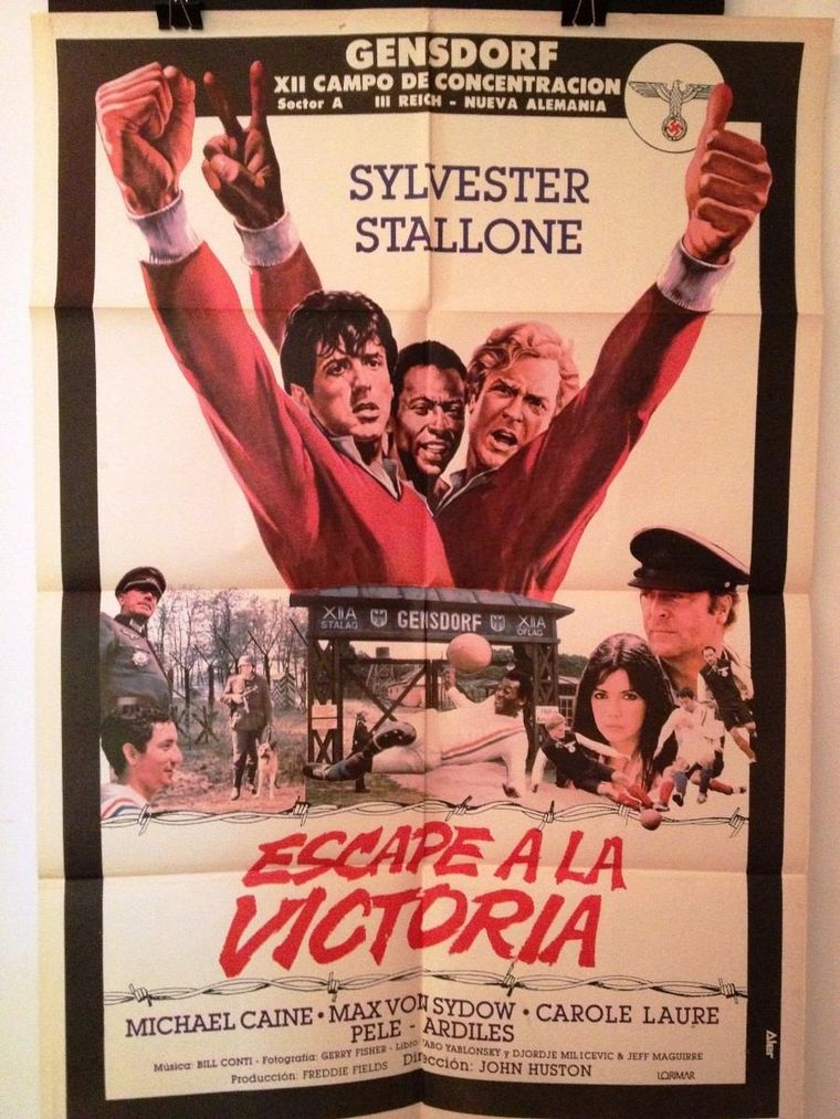 El póster de la película. Arriba, de rojo, Stallone, Caine y Pelé. Abajo a la izquierda, Ardiles