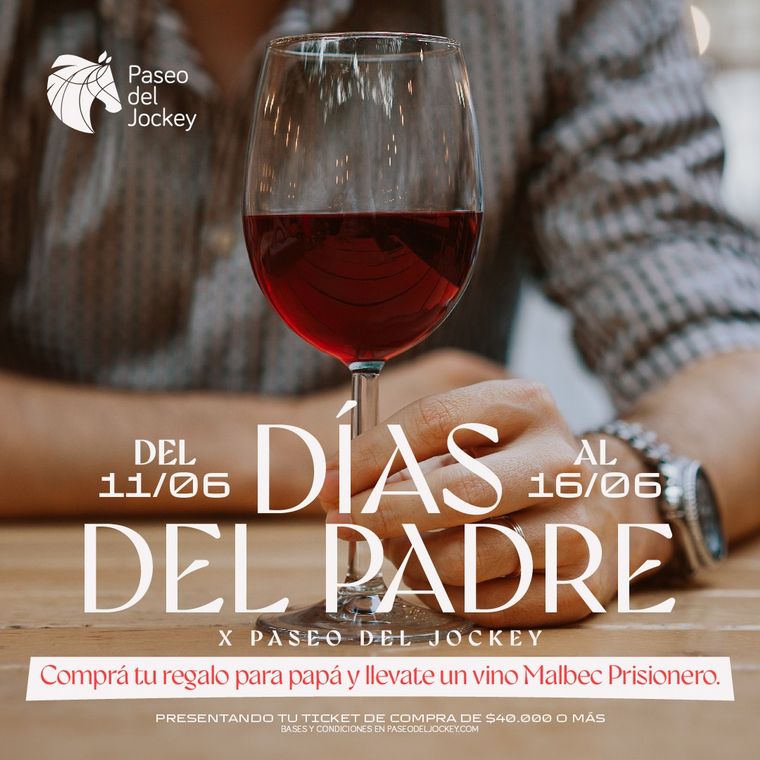 Del martes 11 al domingo 16 de junio, quienes presenten un ticket de compra de $40.000 o más del Paseo del Jockey en el local 219 de planta alta, se llevarán de regalo una botella de vino Prisionero Malbec de 750ml.