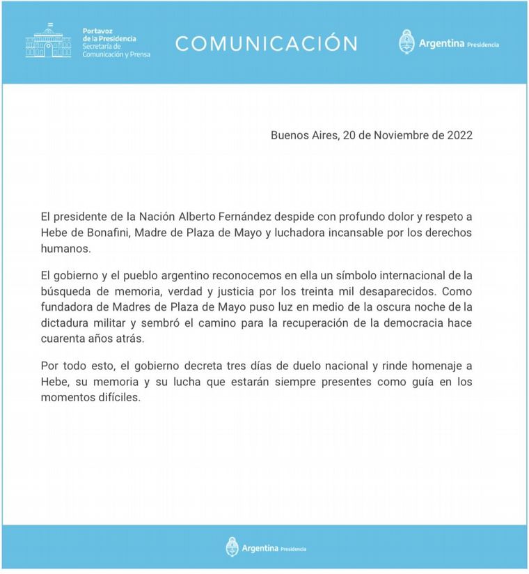 "Por todo esto, el gobierno decreta tres días de duelo nacional y rinde homenaje a Hebe, su memoria y su lucha que estarán siempre presentes como guía en los momentos difíciles", señaló.