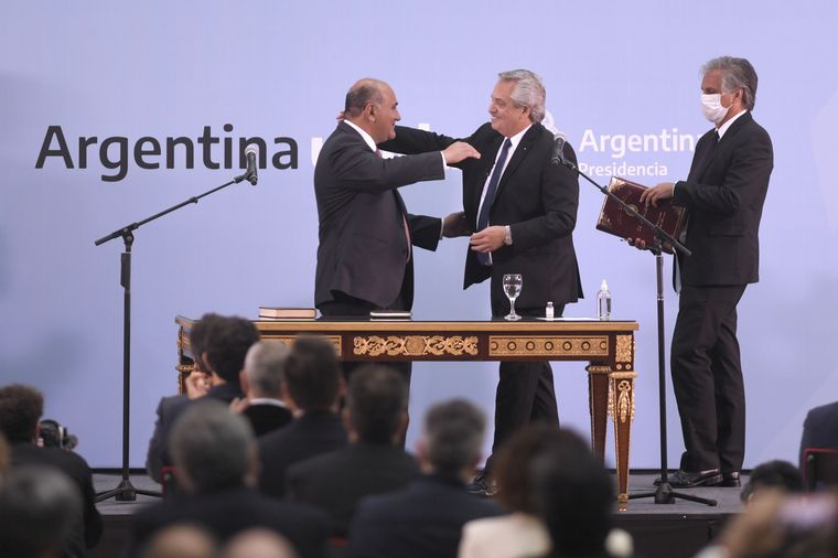 Fernández le tomó juramento, en primer lugar, al nuevo jefe de Gabinete, Juan Manzur, al flamante ministro de Seguridad, Aníbal Fernández, y a Santiago Cafiero como nuevo canciller, tres los nombramientos más importantes para la nueva estructura del Poder Ejecutivo.