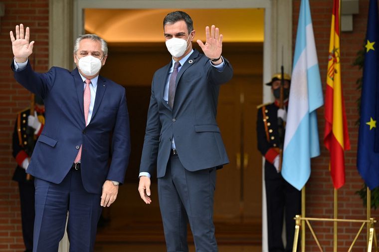 En la declaración conjunta, Alberto Fernández agradeció el respaldo español en los planteos en organismos multilaterales de créditos "frente a la inmensa deuda" que su Gobierno "heredó en 2019" y remarcó la necesidad de que no se cobre la sobretasa en este contexto de pandemia.