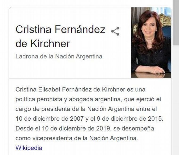 Durante varias horas de la mañana de este domingo, la vicepresidenta Cristina Kirchner aparecía en el buscador de Google como "ladrona de la Nación Argentina" en su panel de conocimiento, situación insólita que fue subsanada por la empresa cerca del mediodía.