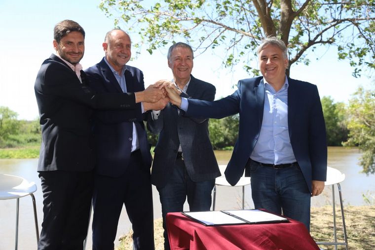 Los gobernadores de Santa Fe, Omar Perotti, y de Córdoba, Juan Schiaretti, firmaron este jueves el contrato de adjudicación entre la unidad ejecutora y la empresa que construirá la primera etapa del Acueducto Interprovincial, que llevará agua desde el río Paraná hasta la provincia mediterránea.
